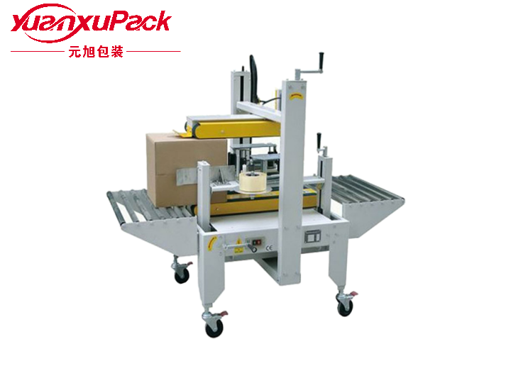 此侧边封箱机性能稳定、品质可靠、封箱效率高、适用性强、使用寿命长;适用于侧边开口的纸箱,如饮料,地砖等,封箱效果平整、规范、美观;采用即贴胶带封口,经济快速、容易调整,两侧边贴带封箱一道完成,方便、快速、稳定。